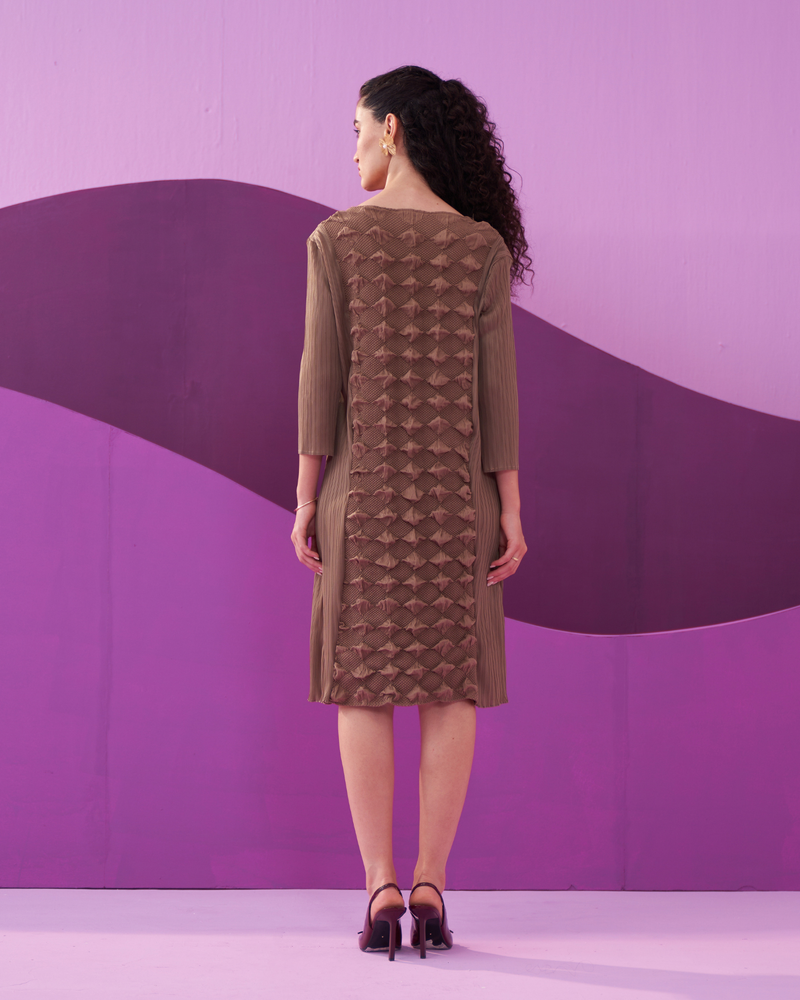 Featuring a brown round neck dress with 3D textured pleating at the center panel and vertical pleating at side panels.